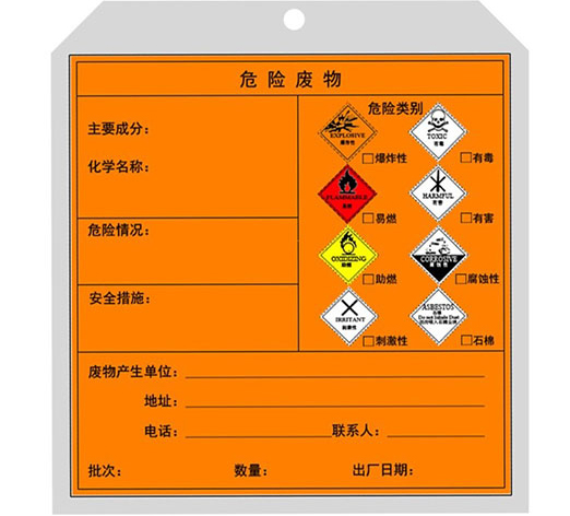 識別標簽包括粘貼式和系掛式。粘貼式危險廢物標簽粘貼于適合粘貼的危險廢物儲存容器、包裝物上,系掛式危險廢物標簽適合系掛于不易粘貼牢固或不方便粘貼但相對方便系掛的危險廢物儲存容器、包裝物上。